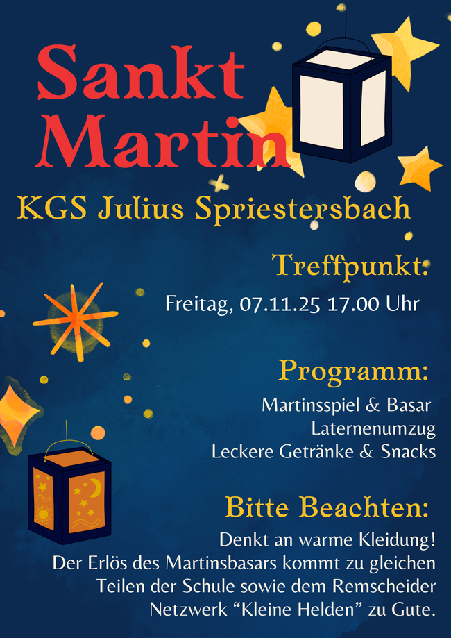 Am 07.11.25 ist es bei uns soweit. Wir feiern unser St. Martinsfest an der KGS Julius Spriestersbach. Dazu laden wir alle Familien an unseren Schulverbund ein.